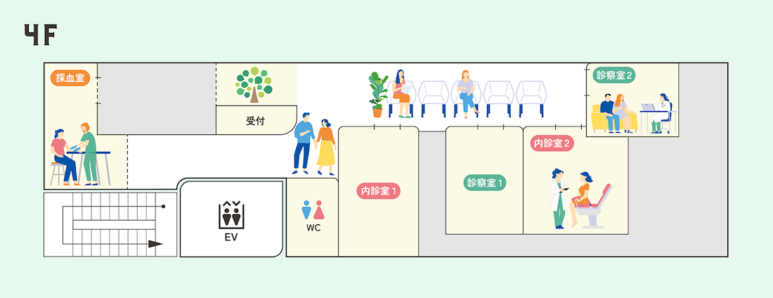 4階(受付・採血室・検査室・内診室1・2・診察室1・2・トイレ)