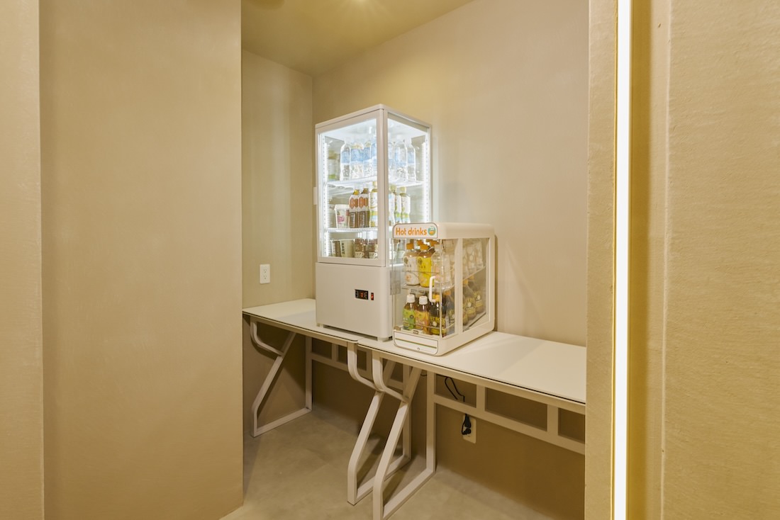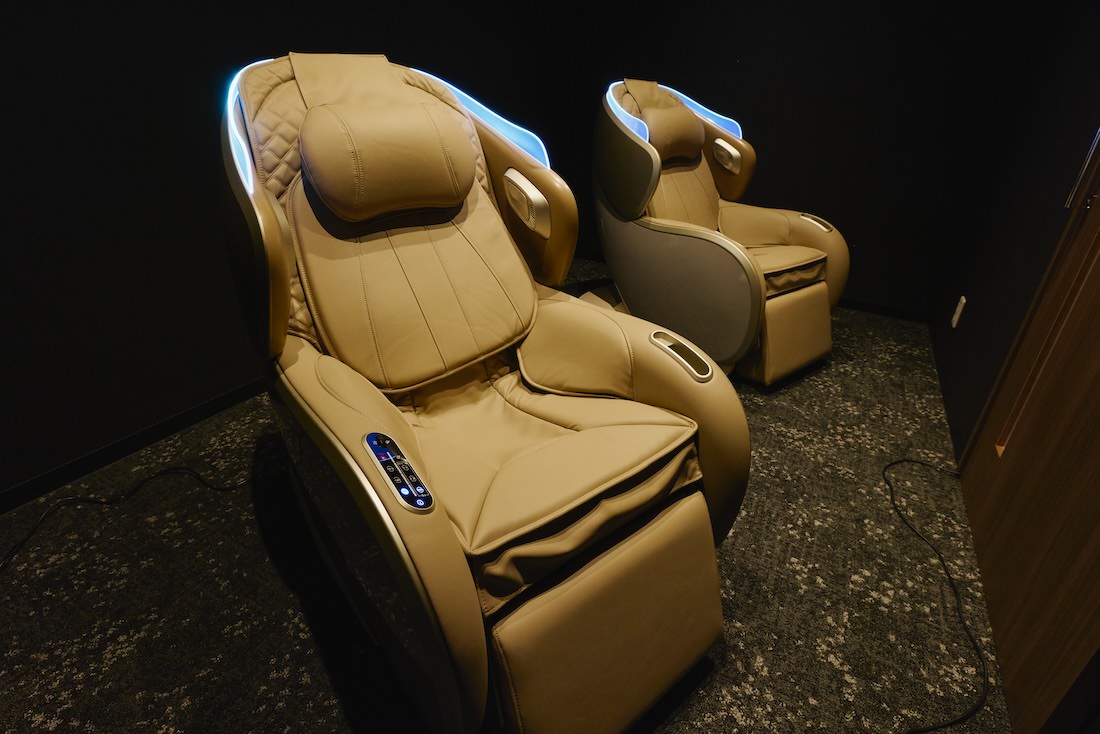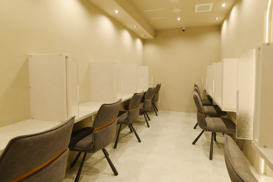 暗室のマッサージチェアでリラックスしていただけるヒーリングルーム十分な空間でゆったりとお過ごしいただける半個室(ご夫婦でご利用いただけます)、隣の方の視線が気にならないカフェ&ワークスペース(WiFi、充電ステーション完備)、お好みのお飲み物を自由に選んでいただけるベンダーコーナー(フリードリンク)