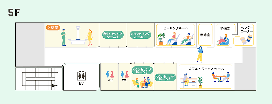 5階(X線室・カウンセリングルーム1・2・3・4・ヒーリングルーム・半個室1・2・カフェ・ワークスペース・トイレ1・2)